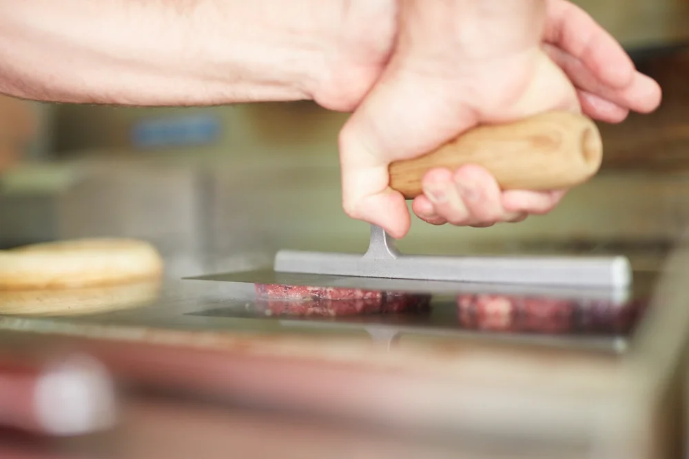 First the select cuts of prime beef are ground and then formed into balls. The ball of meat is placed on a hot chrome plated grill and immediately smashed down onto the grill with a super high-tech tradies trowel.